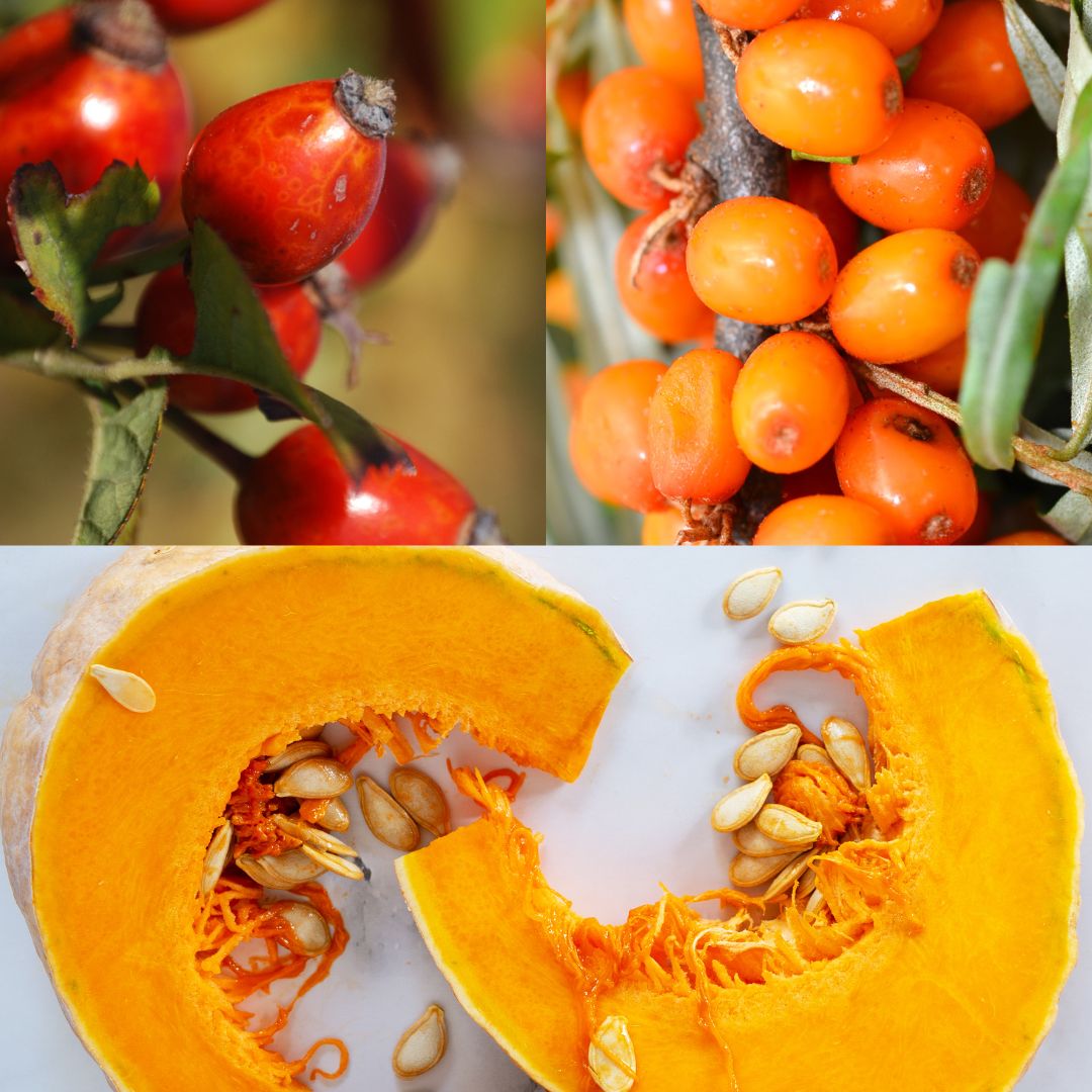 Our Rosehip, Sea Buckthorn, and Pumpkin fruit oils are 100% unadulterated and cold-pressed. Sea Buckthorn contains an exceptional concentration of natural Vitamin C; 12 x higher than that of an orange! And our organic, wild Rosehip and Pumpkin Oils deeply nourish your skin whilst also being high in natural Vitamins A, C, E. This combo is what help reduce discolouration over time.