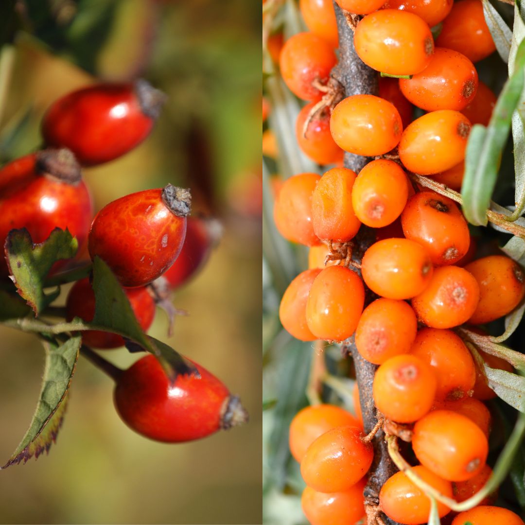Our Sea Buckthorn and Rosehip fruit oils are 100% unadulterated and cold-pressed. Sea Buckthorn contains an exceptional concentration of natural Vitamin C; 12 x higher than that of an orange! And our organic, wild Rosehip Oil is also a natural Vitamin C hero. This combo is ideal for brightening your skin, targeting discolouration and scars, as well as countering the effects of sun damage.