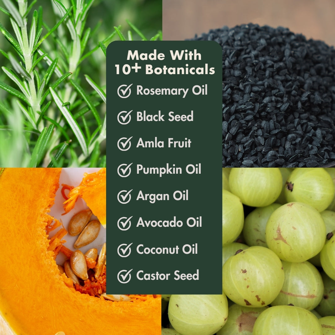 - Combats hair shedding with natural DHT blockers; Amla and Pumpkin seed oils